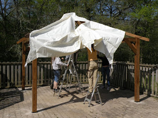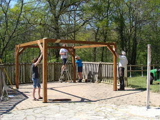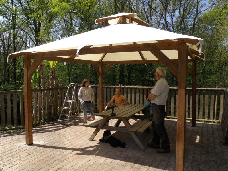 La semaine dernière, nous avons installé la nouvelle pergola à la piscine. Le plan de montage disait qu’elle pouvait être installée par 2 personnes?! … Heureusement, il y avait du monde pour nous aider! Merci petite soeur, beau frère et tous ceux qui nous ont donné un coup de main!
