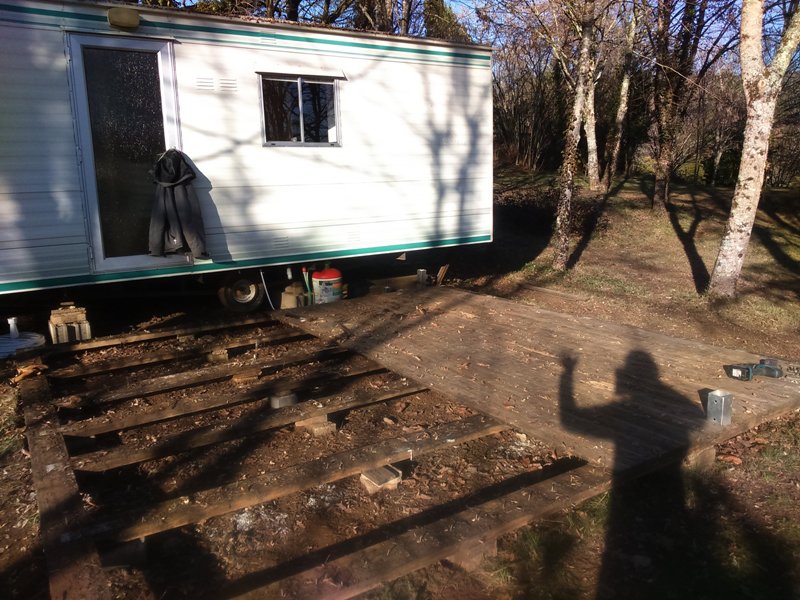 Hier, super beau temps. Pendant que Philippe ramassait les dernières feuilles, j’ai démonté la vieille terrasse au 51. Comme je suis nulle en selfie, c’est mon ombre qui vous fait un petit coucou 🙂 Et oui, devinez qui va avoir une toute nouvelle terrasse cette année!